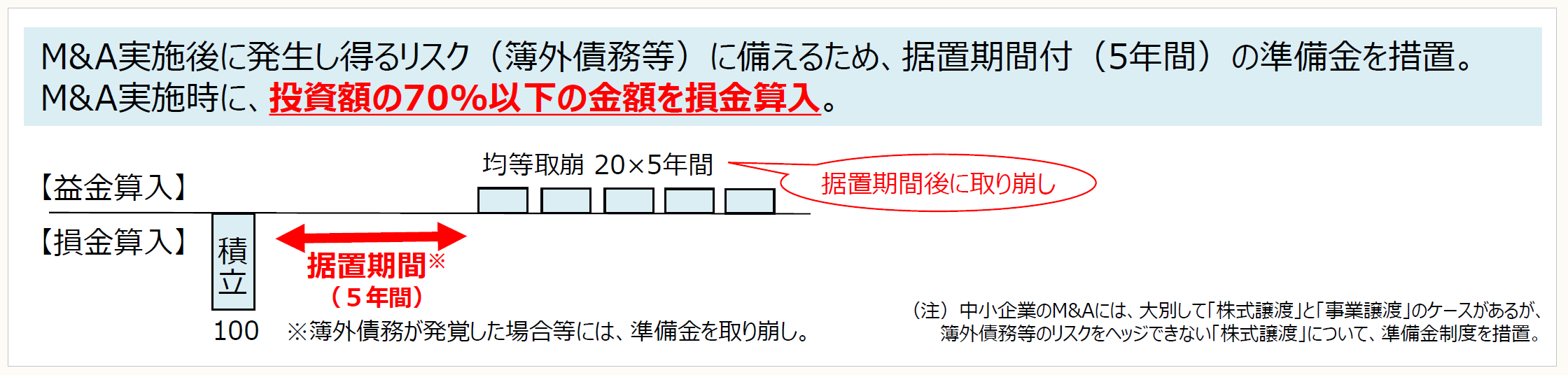 上記①で取得した株式等の価格下落による損失に備えるため、その株式等の取得価額の70%以下の金額を中小企業事業再編投資損失準備金として積み立てた場合、その積立て金額を、その事業年度において損金算入できる。
