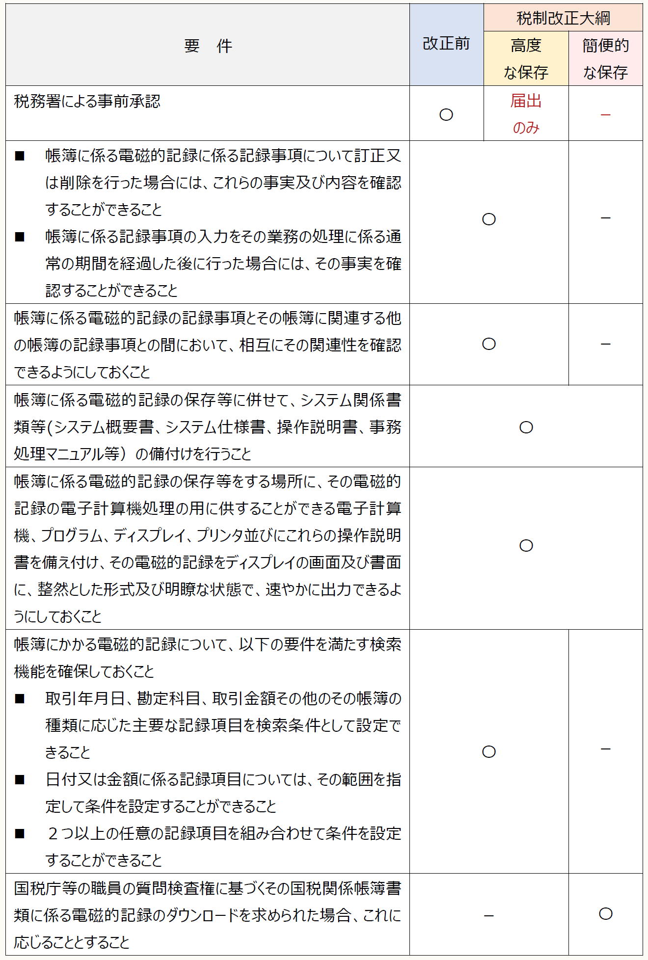 税務署による事前承認が廃止され、また、高度なシステムでない電子帳簿であっても、一定の要件を満たす場合には、電子データのまま保存することが可能となった。そのため、電子帳簿等保存制度は、「高度な保存(改正前と同様)」と「簡便的な保存」に分類されることになる。