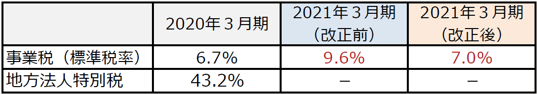 法人事業税の一部を分離して、「特別法人事業税」が創設される。その分、法人事業税の税率が引き下げられる。結果として、「改正前の法人事業税の税率」と「改正後の法人事業税と特別法人事業税の税率の合計」は同じである。