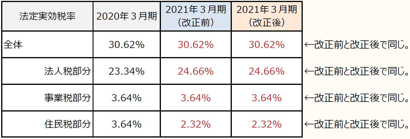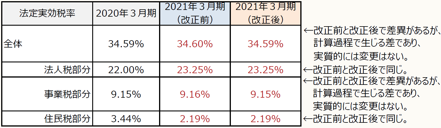 法定実効税率について、前期に使用した法定実効税率から変更はない(※)。具体的な税率は、下記の設例①②を参照されたい。