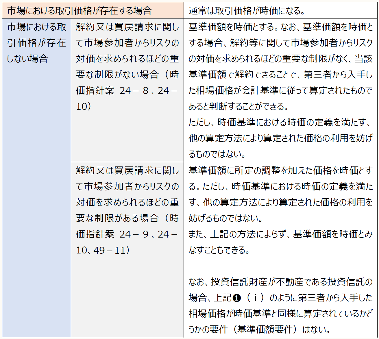 (※) 海外の法令に基づいて設定される投資信託(海外の投資信託)に対して、「基準価額を時価とみなすことができる」規定を適用する際、情報の入手が困難である可能性があることを踏まえ、時価の算定日と基準価額の算定日との間の期間が短い(通常は1ヶ月程度と考えられるが、投資信託財産の流動性などの特性も考慮する)場合に限り、基準価額を時価とみなすことができる(時価指針案24-5)。