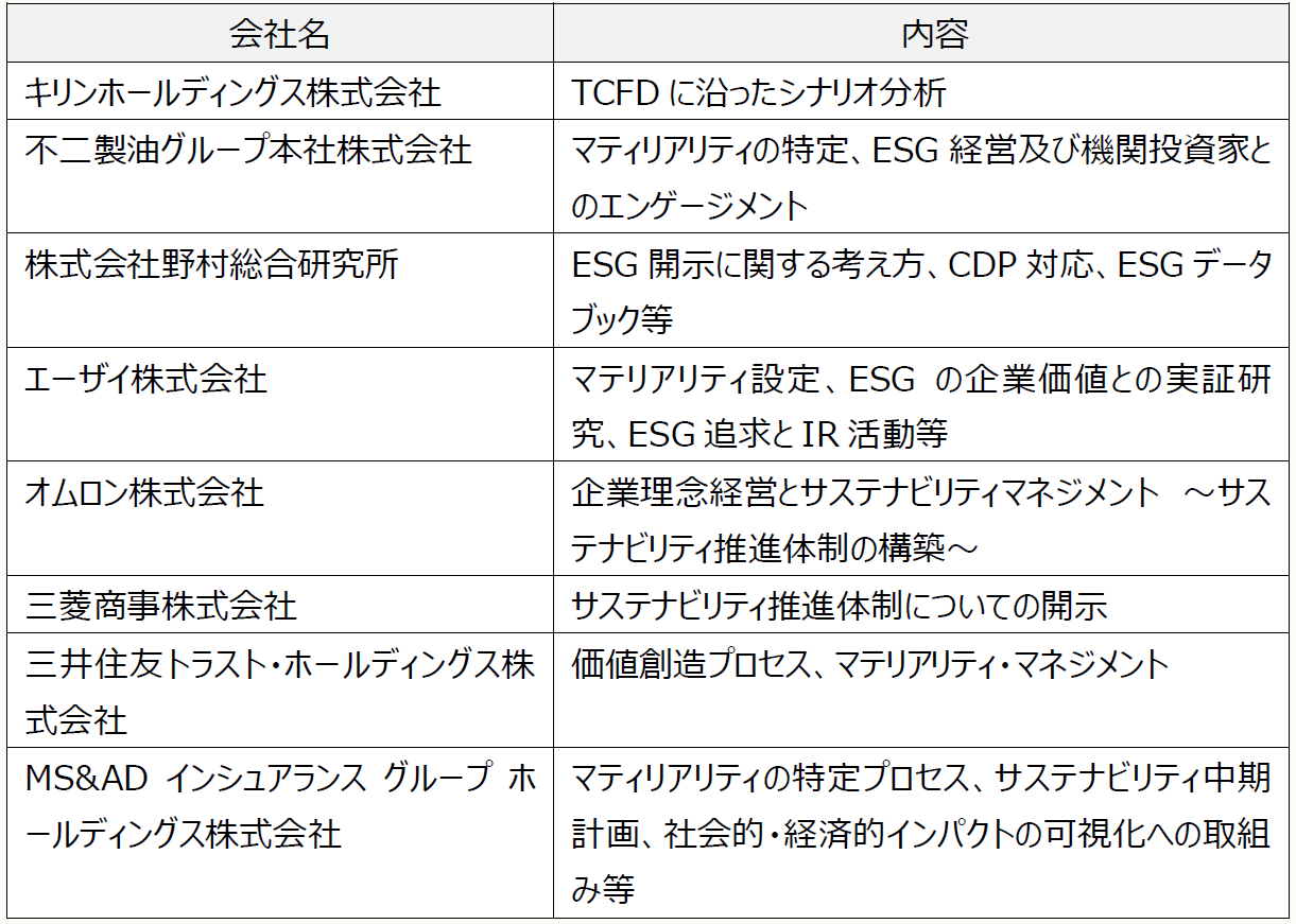 日本取引所グループより、ESG情報を開示している上場会社の開示内容や開示のプロセスの説明が公表されている。公表されている会社は、以下のとおりである。ESG情報の開示にあたり、参考にしていただきたい。
