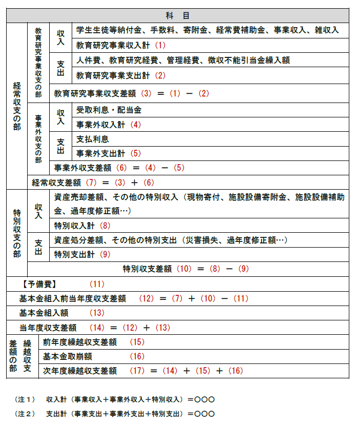 また、近年の臨時・教育研究事業外の収支が増加し複雑化している傾向を踏まえると、その状況をより的確に把握することが重要であり、区分経理を導入し、収支差額を“経常的なもの”(「経常収支の部」)と“臨時的なもの”(「特別収支の部」)とに区分し、さらに経常的な収支を“事業”(「教育研究事業収支の部」)と“事業外”(「事業外収支の部」)とに分けて表示することを求めている。