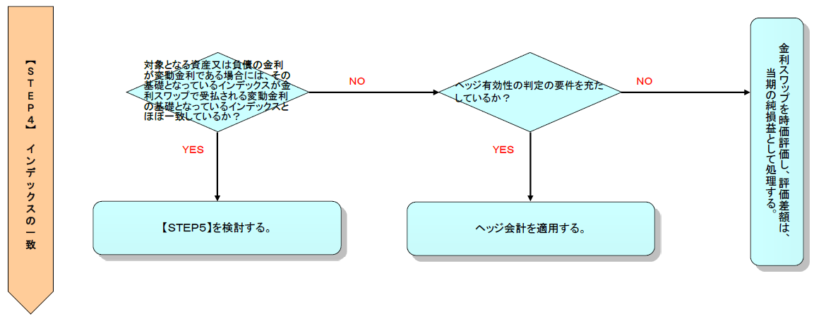 ほぼ一致している場合、【STEP5】を検討する。ほぼ一致していない場合、ヘッジ有効性の判定(【第27回】【STEP3】(1)③及び(2)参照)の要件を充たせば、ヘッジ会計を適用する。充たさない場合、時価評価し、評価差額は、当期の純損益として処理する(実務指針101)。