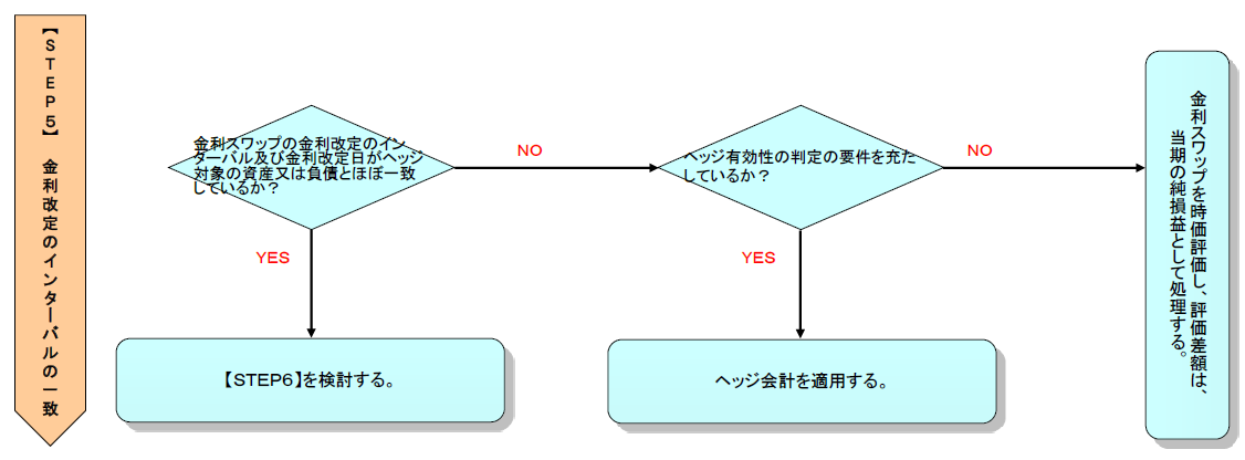 ほぼ一致している場合、【STEP6】を検討する。ほぼ一致していない場合、ヘッジ有効性の判定(【第27回】【STEP3】(1)③及び(2)参照)の要件を充たせば、ヘッジ会計を適用する。充たさない場合、時価評価し、評価差額は、当期の純損益として処理する(実務指針101)。