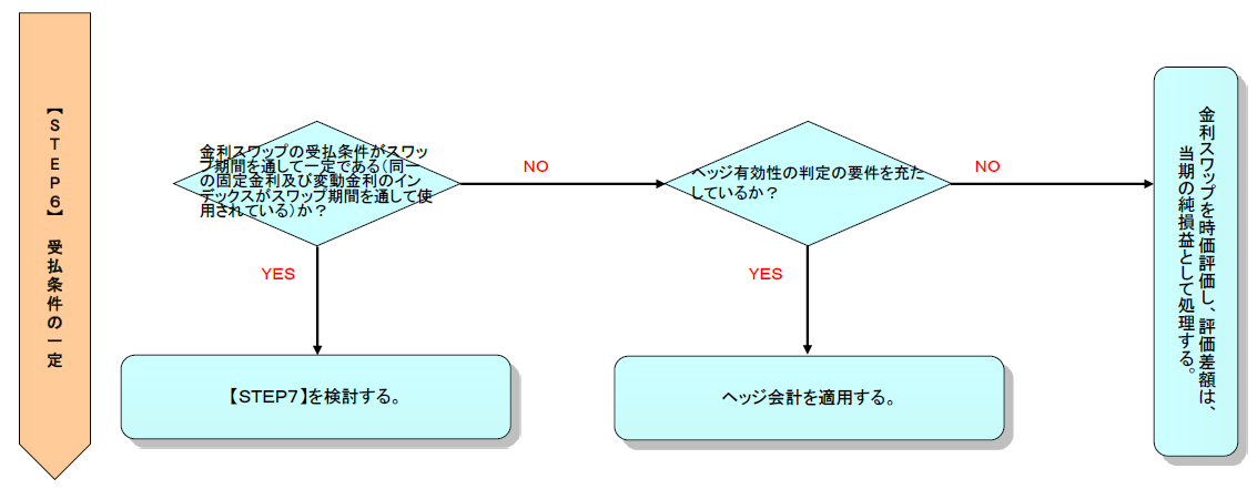 一定である場合、【STEP7】を検討する。一定でない場合、ヘッジ有効性の判定(【第27回】【STEP3】(1)③及び(2)参照)の要件を充たせば、ヘッジ会計を適用する。充たさない場合、時価評価し、評価差額は、当期の純損益として処理する(実務指針101)。