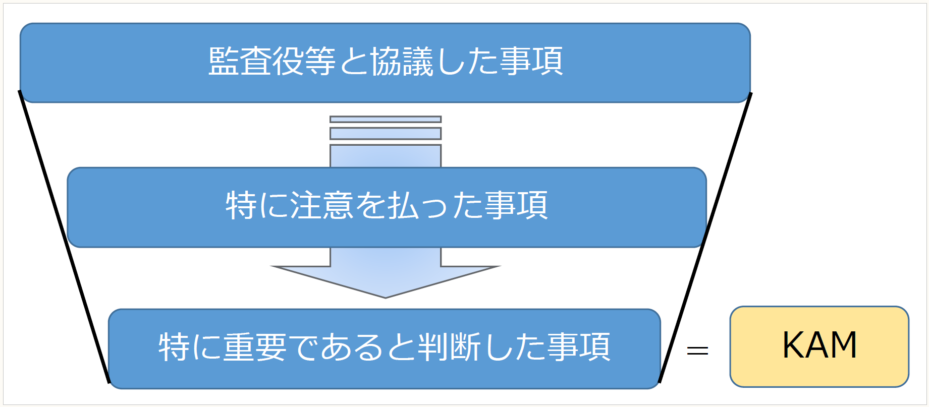 KAMとは、「監査の過程で監査役等と協議した事項の中から、当年度の財務諸表の監査において、職業的専門家として特に重要であると判断した事項」をいう(日本公認会計士協会 監査基準委員会報告書(以下、「監基報」という)701.7)。