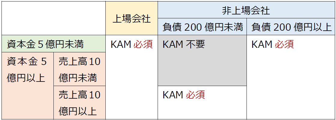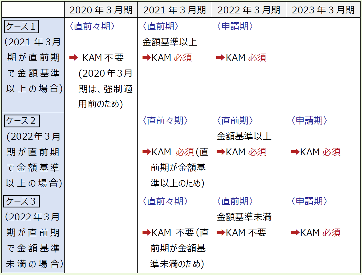 直前期が「資本金5億円未満又は売上高10億円未満」かつ「負債総額200億円未満」に該当しない場合(以下、「金額基準以上」という)、直前々期及び直前期の監査報告書において、KAMの記載が必要である。一方、直前期が「資本金5億円未満又は売上高10億円未満」かつ「負債総額200億円未満」に該当する場合(以下、「金額基準未満」という)、直前々期及び直前期の監査報告書において、KAMの記載は不要である。