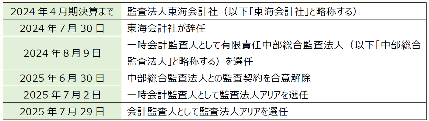 トーシンHDの会計監査人の異動状況は次のとおりである。