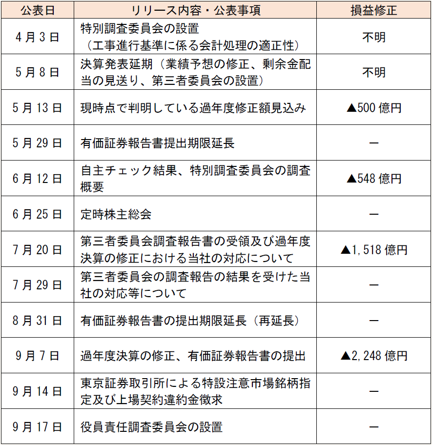 公表日 リリース内容・公表事項 損益修正 4月3日 特別調査委員会の設置(工事進行基準に係る会計処理の適正性) 不明 5月8日 決算発表延期(業績予想の修正、剰余金配当の見送り、第三者委員会の設置) 不明 5月13日 現時点で判明している過年度修正額見込み ▲500億円 5月29日 有価証券報告書提出期限延長 - 6月12日 自主チェック結果、特別調査委員会の調査概要 ▲548億円 6月25日 定時株主総会 - 7月20日 第三者委員会調査報告書の受領及び過年度決算の修正における当社の対応について ▲1,518億円 7月29日 第三者委員会の調査報告の結果を受けた当社の対応等について - 8月31日 有価証券報告書の提出期限延長(再延長) - 9月7日 過年度決算の修正、有価証券報告書の提出 ▲2,248億円 9月14日 東京証券取引所による特設注意市場銘柄指定及び上場契約違約金徴求 - 9月17日 役員責任調査委員会の設置 - 9月30日 臨時株主総会 - 11月7日 役員責任調査委員会の調査結果受領、元社長ら5人に対し損害賠償請求 - 11月9日 役員責任調査委員会調査報告書公表 -