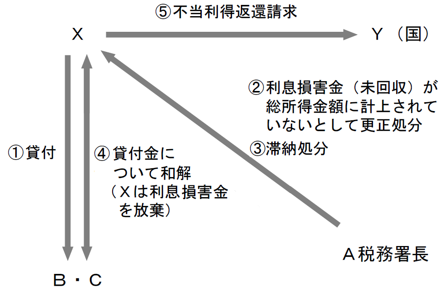 Xは、B・Cに金員を貸し付けていたが、昭和28年分の所得税の確定申告において、この貸付金に対する昭和28年分の利息損害金(ただし未回収)を総所得金額に計上しなかった。そこで、A税務署長は、Xに対し、この点を指摘して更正処分を行い、さらに滞納処分を行った。