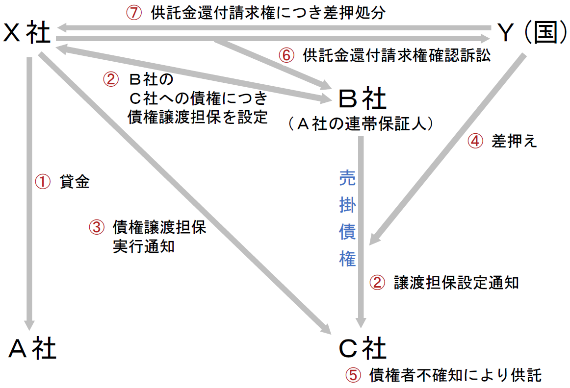 B社は、A社のX社からの借入金につき連帯保証をし、これに伴い、B社がC社との継続的取引に基づいて取得する売掛代金債権(将来の債権を含む)について、X社のために債権譲渡担保を設定して、C社に対し、確定日付のある書面で設定通知をした。その後B社が手形不渡りを出したため、X社はC社に対し債権譲渡担保の実行通知をした。他方、Y(国)も、B社への滞納処分として、B社のC社に対する売掛債権を差し押さえた。C社が債権者不確知により供託したため、X社は、Y・B社を相手に供託金還付請求権を有することの確認を求める訴訟を提起し、最終的にこれは認容された。