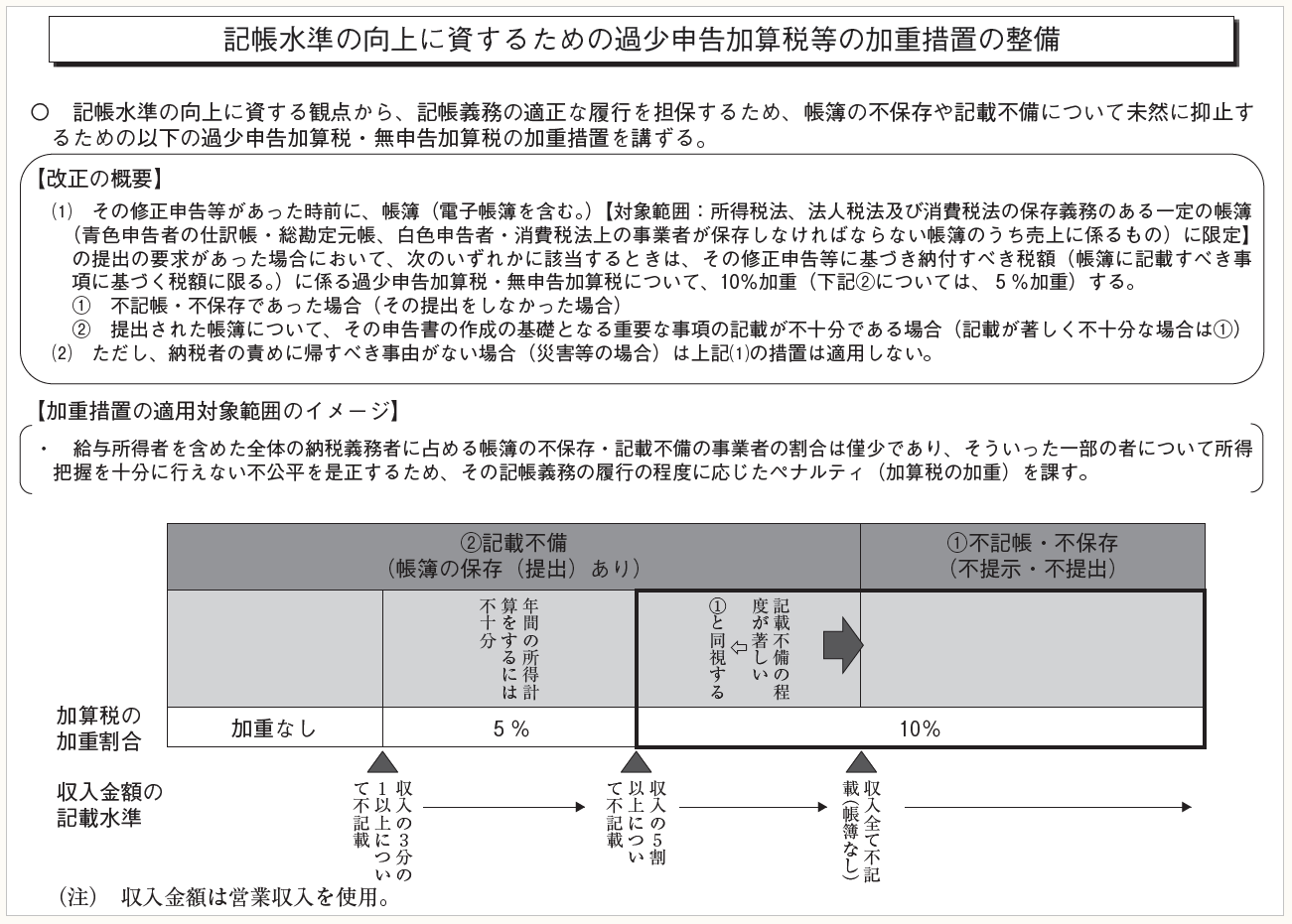また、記帳や帳簿保存義務を果たさなくても、その記帳や帳簿保存が不十分であることのみでは仮装隠ぺいの事実に該当しないことから重加算税の賦課が困難となる場合があり、記帳義務不履行に対する経済的な不利益が少ないことが記帳の動機付けを乏しくさせているという問題が国税当局において問題視されていた。
