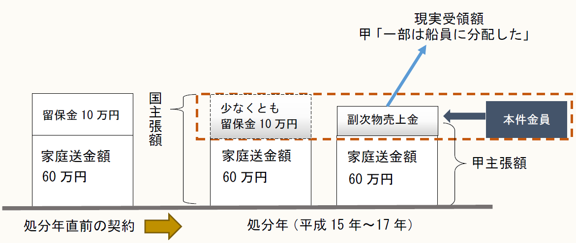 • 上記と処分年の前年までのA社と甲との乗船契約により、月固定給が70万円、家庭送金が60万円(留保金は月10万円となる)とされていることを併せ考えれば、処分年においても甲の月固定給のうち少なくとも10万円が留保金とされていたと認められる。