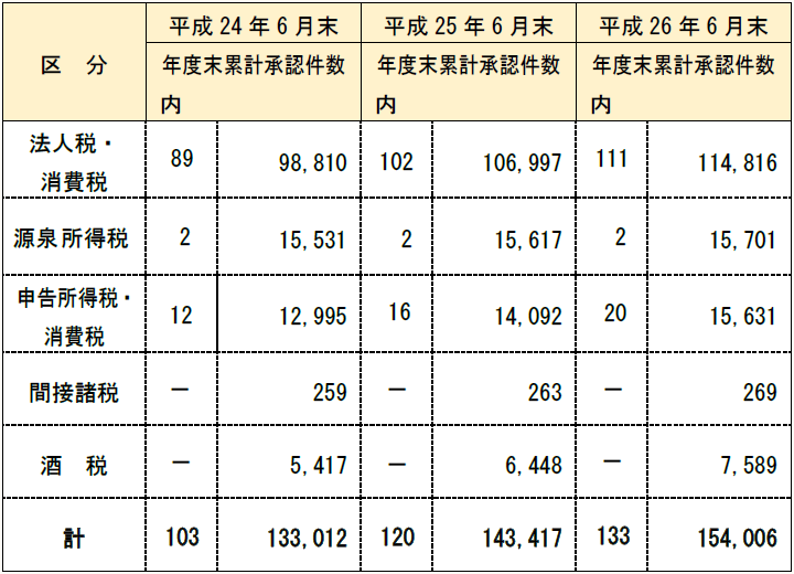 平成10年7月に施行された電子帳簿保存法は、本稿を執筆している平成27年で17年が経過した。平成26年6月末現在で電子帳簿保存法の承認を受けている件数は約154千件であり、過去の件数は下表のとおりである。