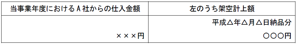 当事業年度におけるA社からの仕入金額	左のうち架空計上額  ×××円	平成△年△月△日納品分 〇〇〇円