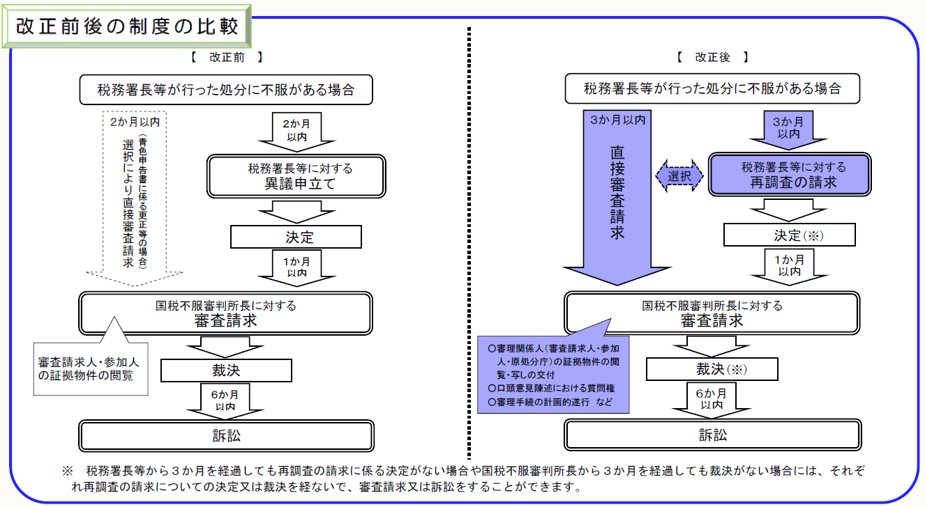 平成26年6月、国税通則法の改正が行われ、不服申立て制度(異議申立て、審査請求)に係る規定が大きく変更された。当該改正法は、本稿公開日の翌日である、平成28年4月1日以降になされた処分から適用される。