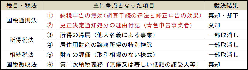 今回の公表裁決では、国税不服審判所によって課税処分等が一部取消された事例が2件、棄却又は却下された事例が4件であった。税法・税目としては、国税通則法と所得税法関係が各2件、相続税法と国税徴収法関係が各1件であった。