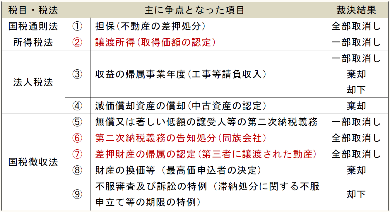 今回の公表裁決では、国税不服審判所によって課税処分等の全部又は一部が取り消された裁決が6件、棄却又は却下された裁決が3件となっている。税法・税目としては、国税通則法及び所得税法が各1件、法人税法が2件、国税徴収法が5件と、国税徴収法関係の裁決事例が多く公表されている。