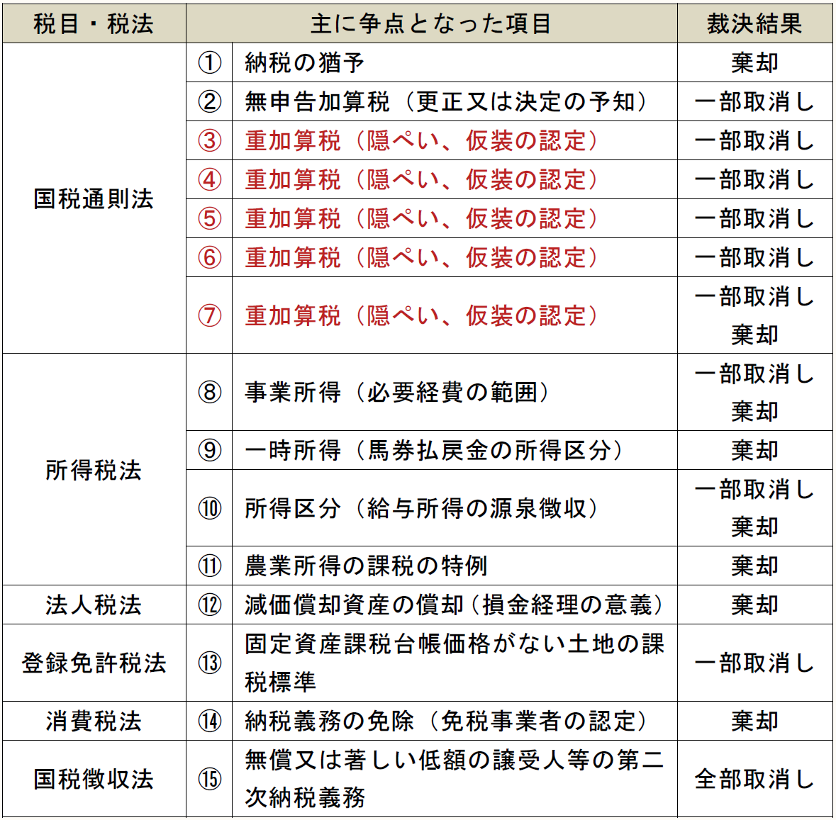 その他の税法別の分類は、所得税法が4件、法人税法、登録免許税法、消費税法及び国税徴収法がそれぞれ1件となっている。今回の公表裁決では、国税不服審判所によって課税処分等の全部又は一部が取り消された裁決が10件、棄却された裁決が5件となっている。