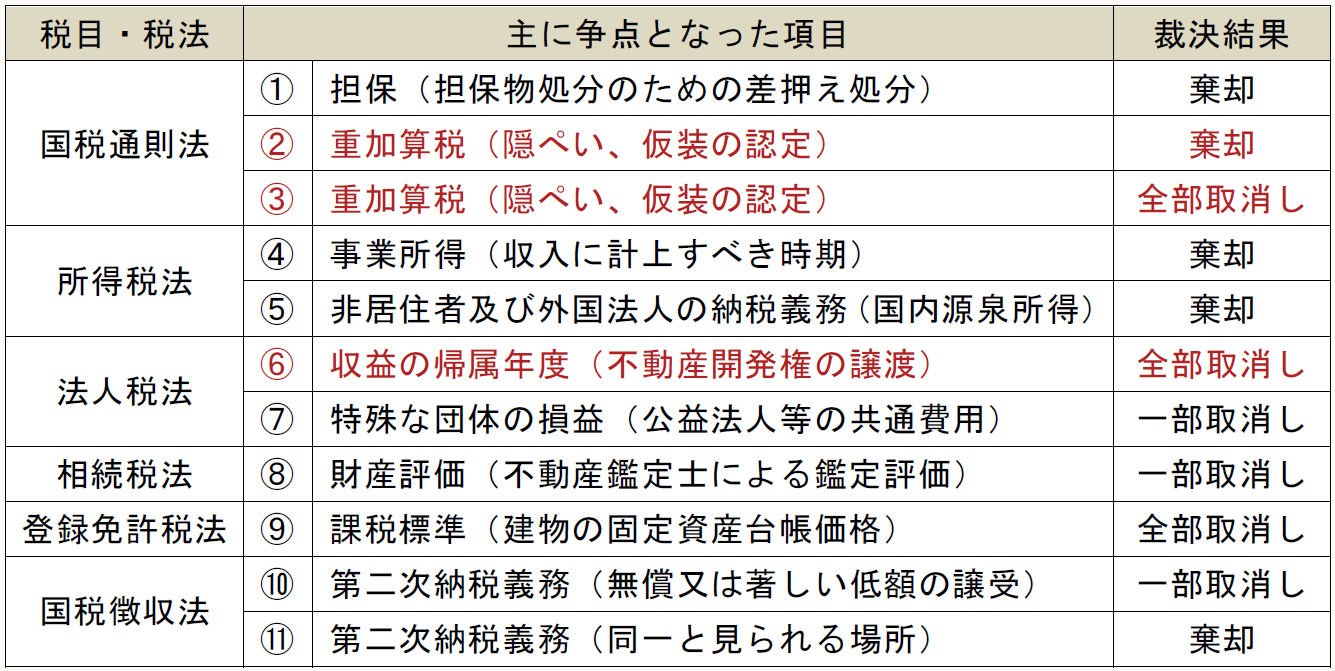今回追加された裁決は表のとおり、全11件で、国税通則法が3件、所得税法、法人税法及び国税徴収法が各2件、相続税法及び登録免許税法が各1件となっている。11件の公表裁決のうち、国税不服審判所によって課税処分等の全部又は一部が取り消された裁決が6件、棄却された裁決が5件となっている。