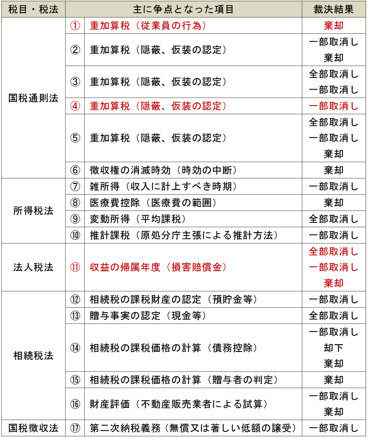 国税不服審判所によって課税処分等の全部又は一部が取り消された裁決が13件、棄却された裁決が4件となっている。