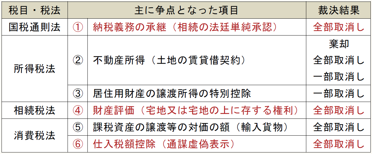 今回の公表裁決では、6件のすべてが国税不服審判所によって、原処分庁の課税処分等の全部又は一部が取り消されている。