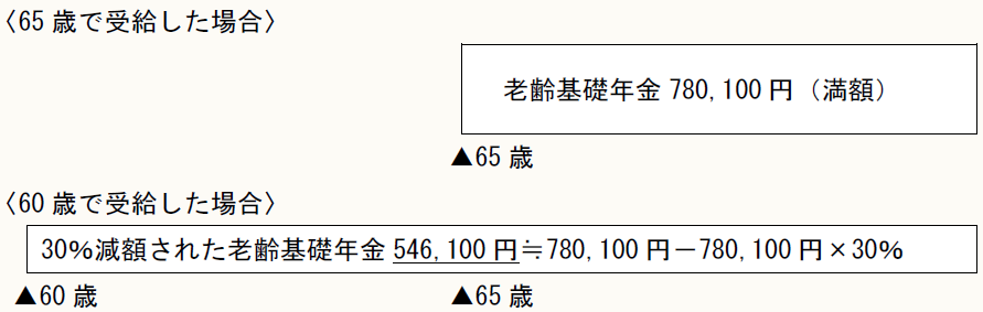 60歳から支給される年金は546,100円になり、65歳から受給できる額に比べて234,000円(780,100円-546,100円)減額される。