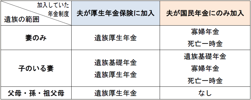 遺族給付は、死亡した人が加入していた年金制度と遺族の範囲により受給者が決定される。たとえば、夫が死亡した場合における遺族の範囲と遺族年金等の種類は次のようになる。