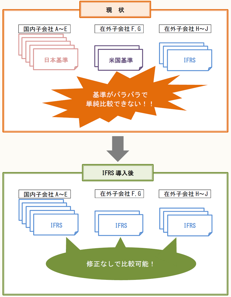 「なるほど。ウチの子会社10社のうち5社は海外子会社ですよね。ヨーロッパやアジアの子会社はIFRSを使ってますけど、アメリカの子会社は米国基準を採用しています。国内の子会社はもちろん日本基準ですから、これらの業績を並べたところで、単純に比較できないですね。もしIFRSという1つの会計基準をグループ全体で使えば、その問題も解消できるというわけですね。」