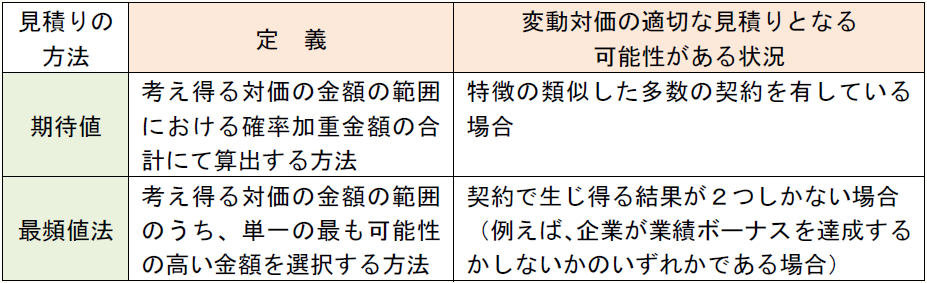 契約において約束された対価に変動対価を含んでいる場合には、企業は、約束した財又はサービスの顧客への移転と交換に権利を得ることになる対価の金額を見積もる(意見募集226)。見積り方法には、「期待値法」と「最頻値法」がある(意見募集229)。