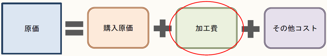 「続いて加工費だけど、これには生産単位に直接関係するコストである製造直接費と製造間接費の規則的な配賦額のことだよ。ウチの会社でもお馴染みの項目だね。」