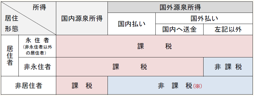 所得税の課税の対象となる所得の範囲は、個人の居住形態に応じて次の通り定められている(所法7①一・二・三)。