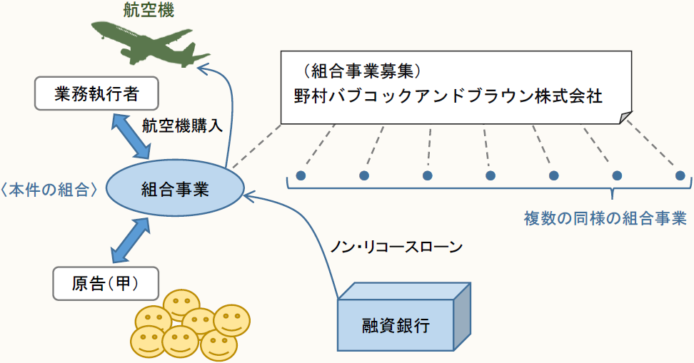原告(甲)は、他の出資者と共に組合契約を締結して民法上の組合を組成した上、金融機関から金員を借り入れて航空機リース事業を営んでいたが、予定前に航空機を売却して事業を終了することとなった。その際、①航空機の購入原資の一部となった借入金に係る債務の免除を受けたことによる利益(本件債務免除益)及び、②当該組合の業務執行者に対して支払うべき手数料に係る債務の免除を受けたことによる利益(本件手数料免除益)が発生し、これらの所得区分を巡って争いとなった。