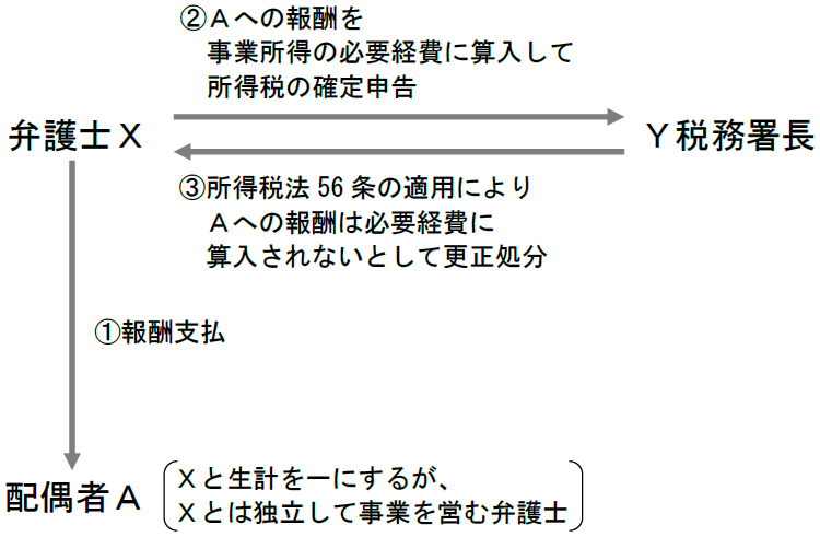 今回紹介する判例は、弁護士Xが、配偶者A(Xと生計を一にするが、Xとは独立して弁護士業を営んでいる)に対し、Xの業務に従事した労務の対価として報酬を支払い、これを事業所得の必要経費に算入して所得税の確定申告をしたところ、Y税務署長が、所得税法56条を適用し、Aへの報酬を必要経費に算入することを認めず、更正処分を行ったという事案である。