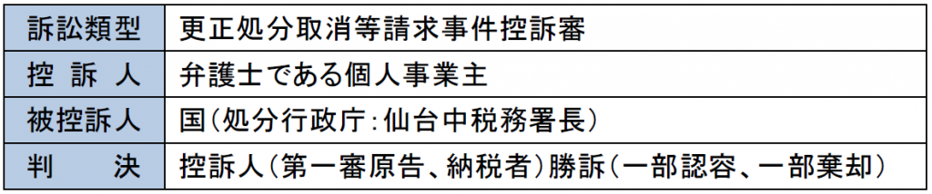 弁護士を開業している納税者(控訴人、第一審原告)の所得税の確定申告について、仙台中税務署長は、納税者が仙台弁護士会会長及び日弁連副会長としての職務に関係して支出した費用(主に会務の前後に行われた懇親会、慰労会等の支出)は、事業所得の金額の計算上、必要経費に算入することはできず、また、消費税法における課税仕入にも該当しないとして、所得税及び消費税等の更正処分を行った。