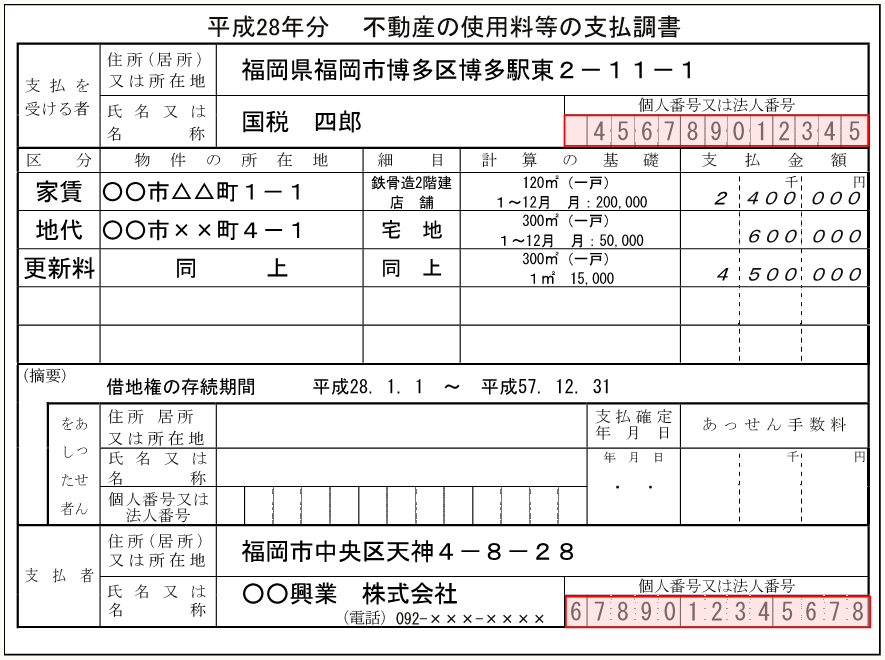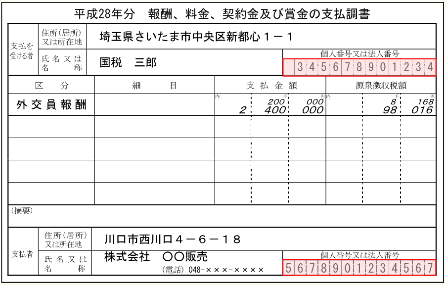 平成28年分の源泉徴収票や支払調書には、マイナンバー制度の導入に伴い、支払を受ける者やその控除対象配偶者等の個人番号と支払者の法人番号(又は個人番号)を記載する欄が新たに設けられている。