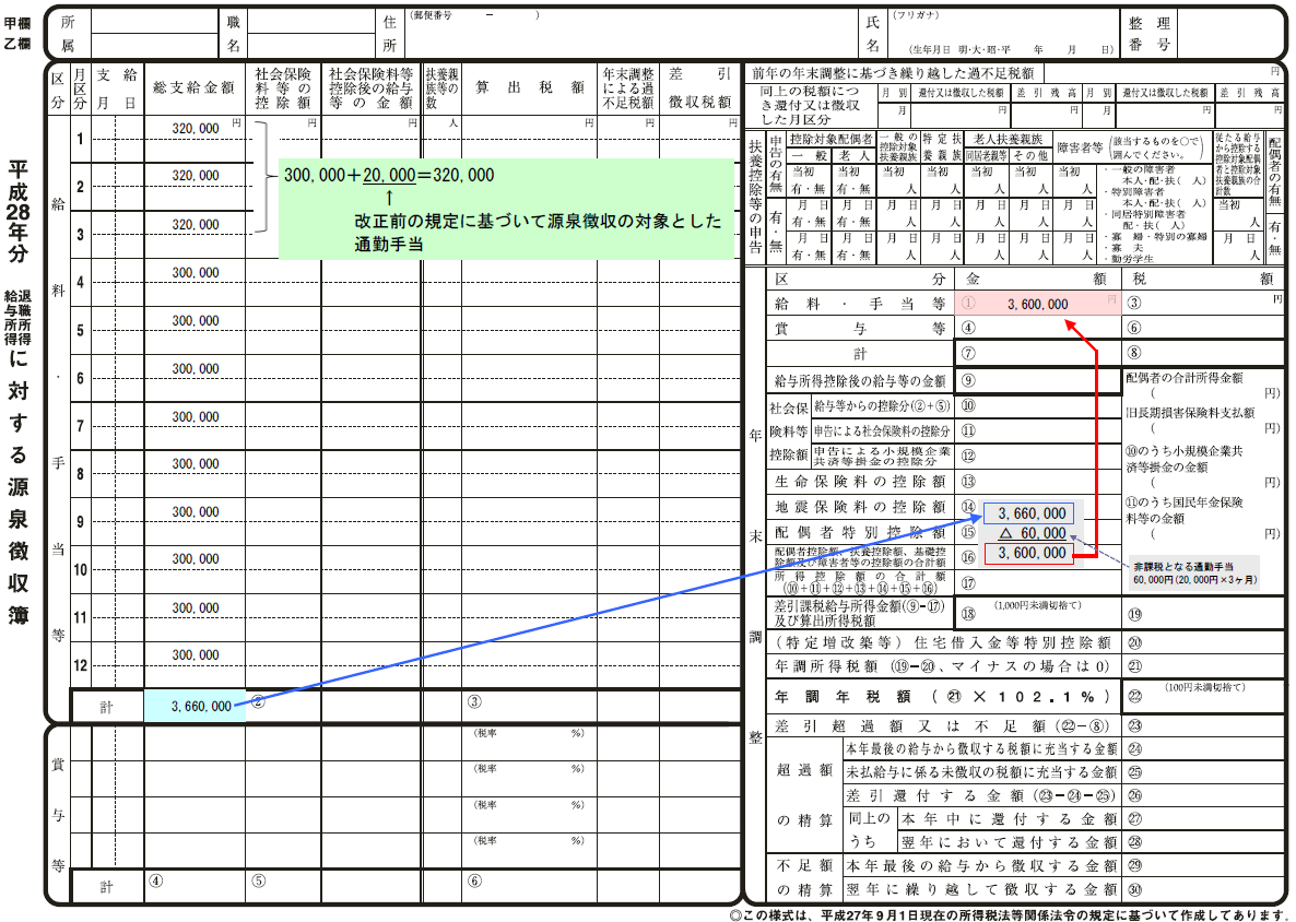 本年1月1日から3月31日までの間に支払われた通勤手当については、改正前の規定に基づいて源泉徴収が行われている。