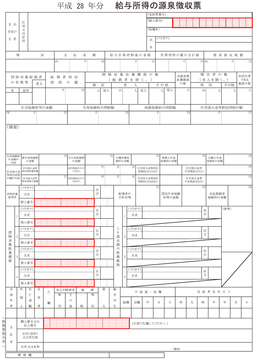 平成28年分の源泉徴収票や支払調書には、マイナンバー制度の導入に伴い、支払を受ける者やその控除対象配偶者等の個人番号と支払者の法人番号(又は個人番号)を記載する欄が新たに設けられている。