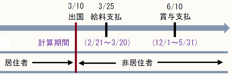 甲の場合、3月10日に出国しているが、給料の計算期間(2月21日から3月20日(1ヶ月)までの間)には、国内の勤務期間と国外の勤務期間の両方があることから、3月25日支払いの給料から所得税等の源泉徴収はなされない。