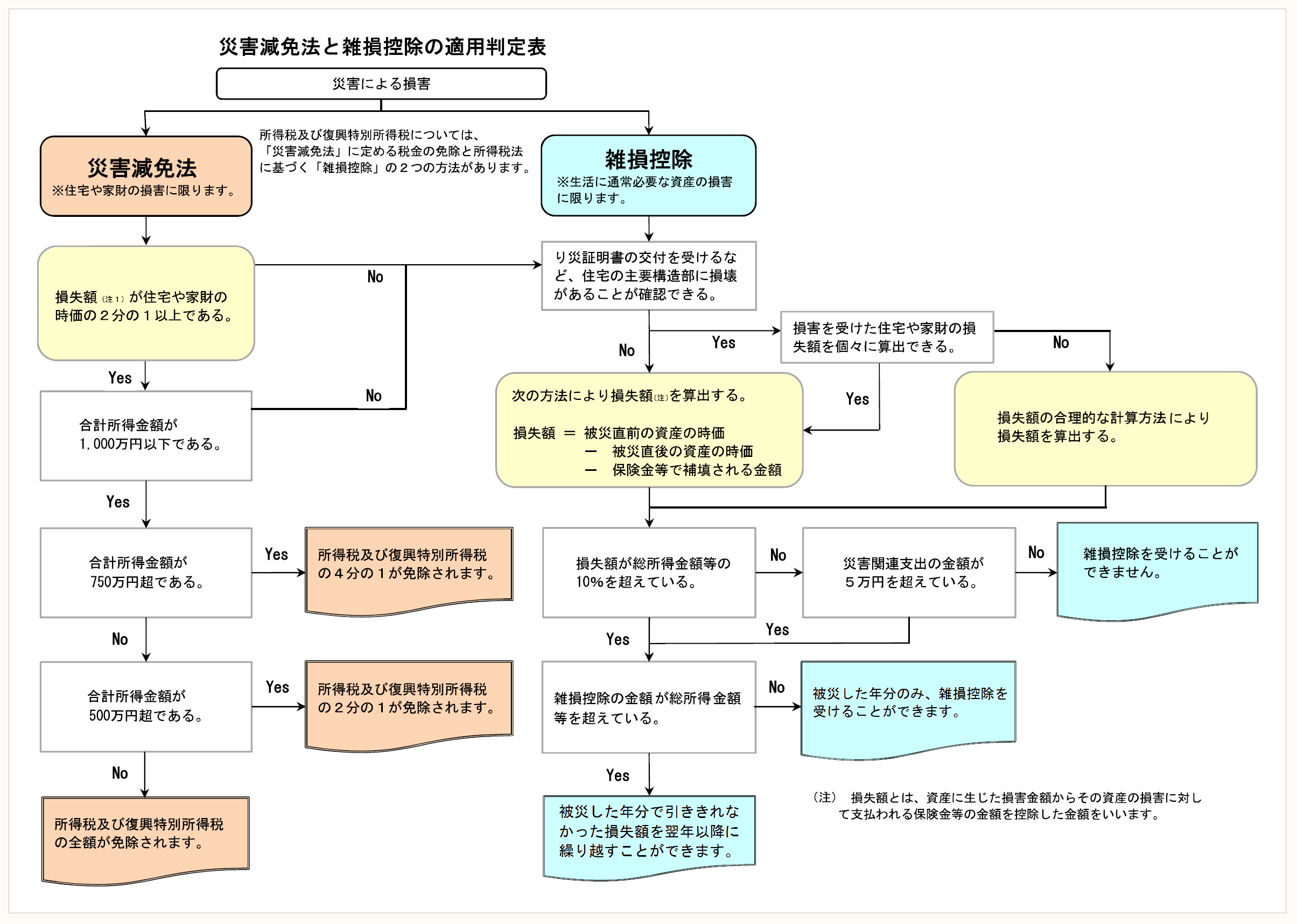 個人が災害により住宅や家財等に損害を受けた場合には、所得税法に基づく雑損控除(以下、雑損控除という)と災害減免法に基づく所得税の軽減免除(以下、所得税の軽減免除という)のうち、いずれか有利な方を選択することができる。