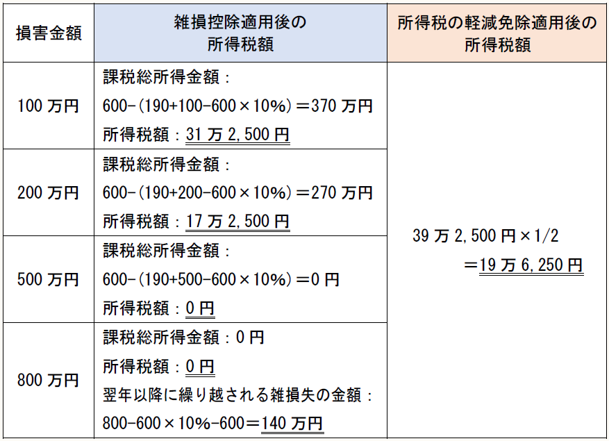以上の試算から、本計算例では、損害金額が200万円を少し超える額までであれば、所得税の軽減免除の方が有利となる。