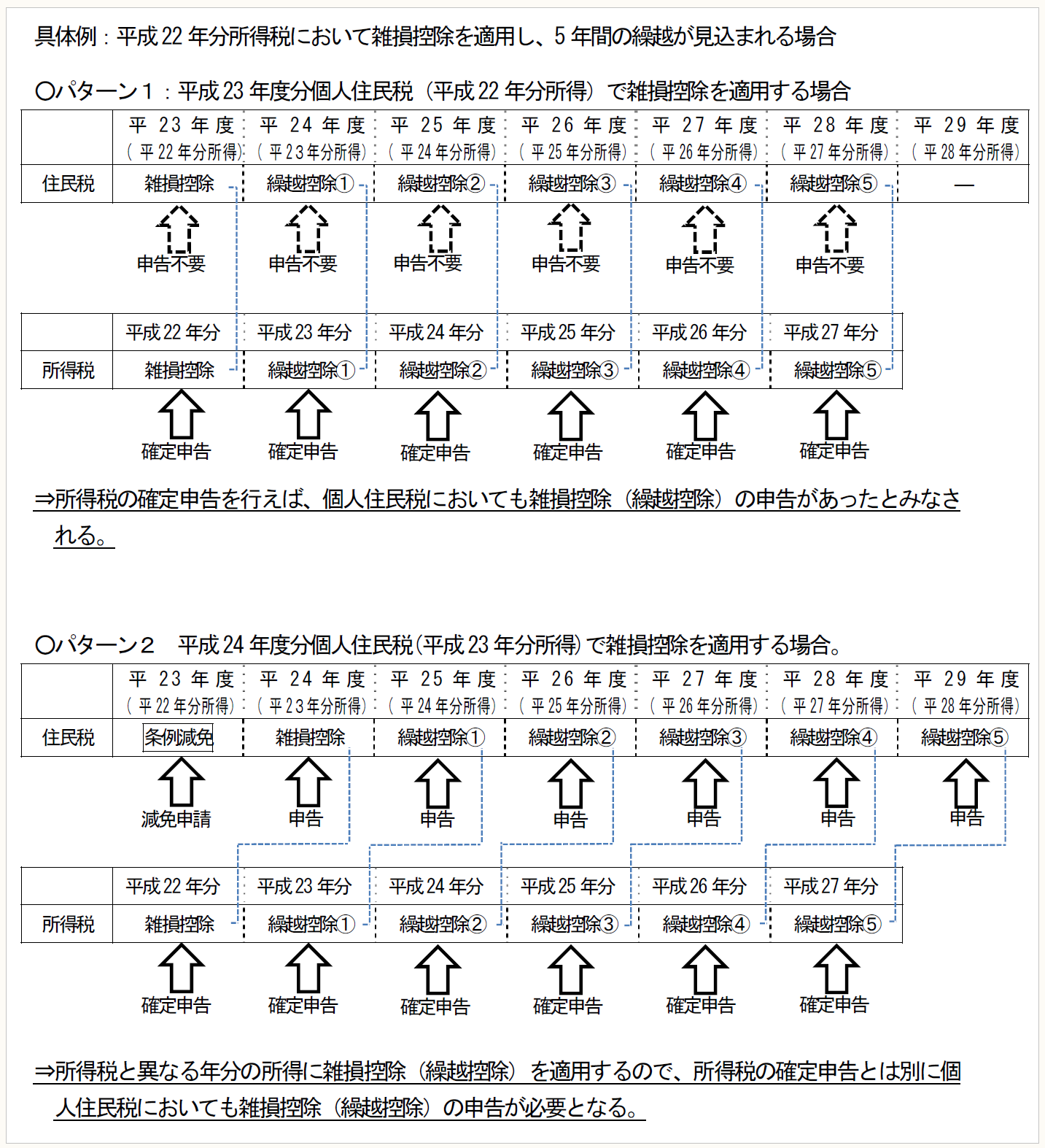 前年分の所得税の確定申告書を提出している場合には、当年分の個人住民税の申告書が提出されたものとみなされる。したがって、前年分の所得税の確定申告で雑損控除を適用していれば、自動的に当年分の個人住民税において雑損控除が適用される。ただし、個人住民税の申告を行うことにより、所得税で雑損控除を適用する所得と異なる年分の所得について住民税の雑損控除を適用することもできる。
