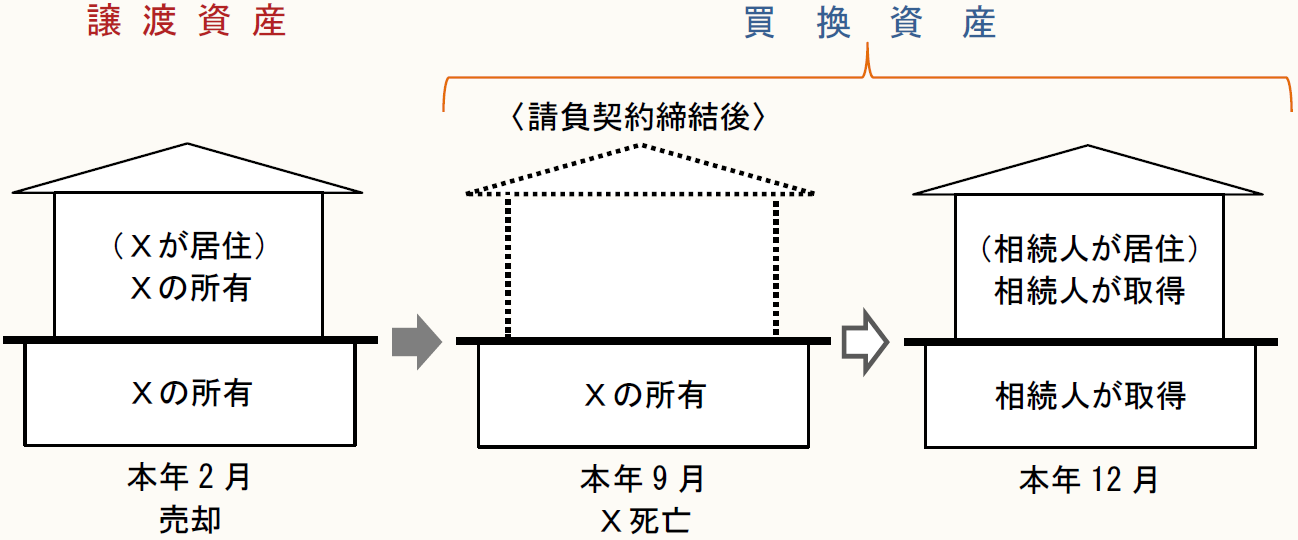 Xは、本年2月に自己の居住用の土地家屋(所有期間が10年超で居住期間は10年以上)を6,000万円で売却して、その売却代金をもって4,000万円の土地を購入し、家屋についても請負契約を締結したのですが、完成前の9月に死亡してしまいました。
