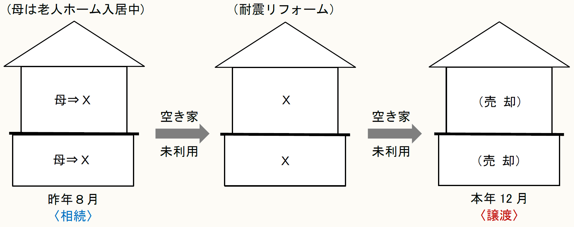 Xは、昨年8月に死亡した母親の家屋(昭和56年5月31日以前に建築)とその敷地を相続により取得した後、耐震リフォームをした上で、本年12月に4,800万円で売却しました。母親は、相続の開始の直前において老人ホームに入居していて、既にその家屋を居住の用に供していませんでした。また、母親が老人ホーム入居後から譲渡の時まで空き家でした。