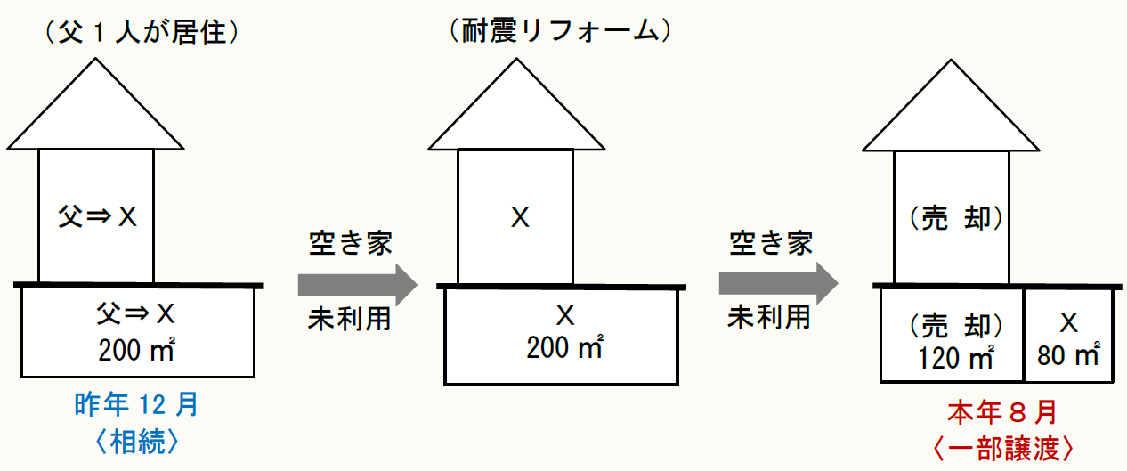 Xは、昨年12月に死亡した父親の居住用家屋(昭和56年5月31日以前に建築)とその敷地(200㎡)を相続により取得し、その家屋を耐震リフォームした後に、その敷地の庭部分(80㎡)を残して、本年8月に6,200万円で売却しました。
