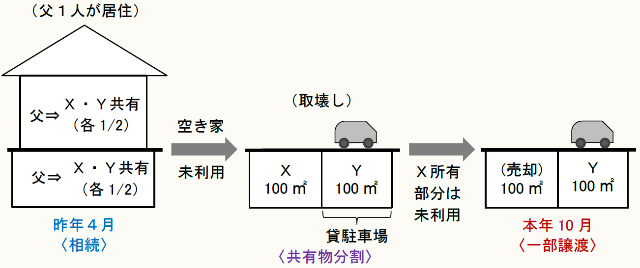 X(姉)とY(妹)は、昨年4月に死亡した父親の居住用家屋(昭和56年5月31日以前に建築)とその敷地200㎡を相続により共有(各1/2)で取得して、その家屋を取り壊し更地にした上で、その敷地を共有のまま分筆して、分筆後の各土地をXとYそれぞれの単独所有としました。