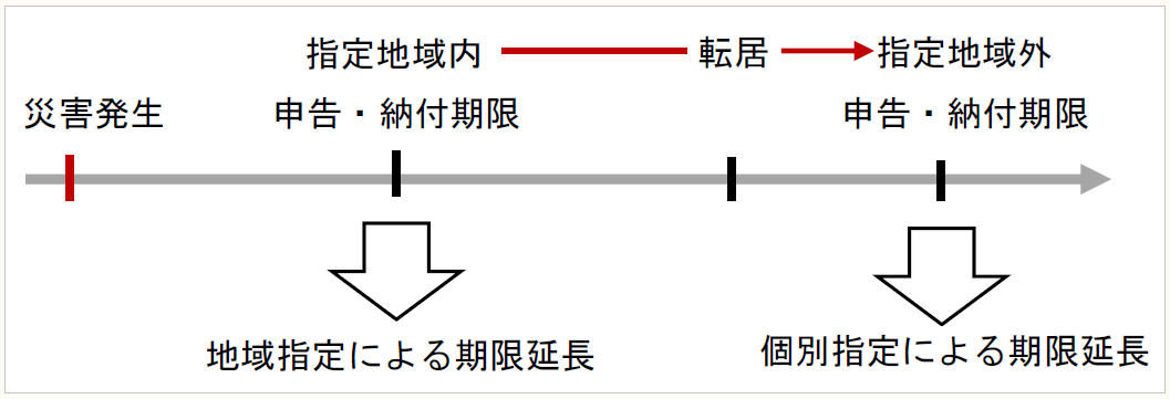 ただし、地域指定による期限延長措置の対象とならない場合でも、転居先の所轄税務署長に対して「災害による申告、納付等の期限延長申請書」を提出し承認を受ければ、税務署長が指定する日まで申告・納付等の期限が個別に延長される。