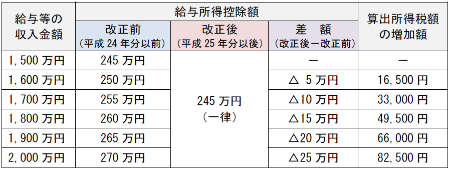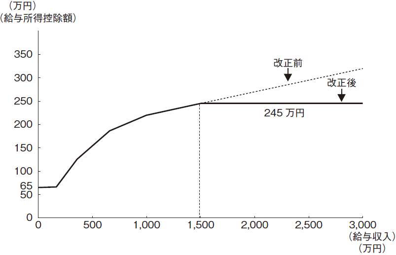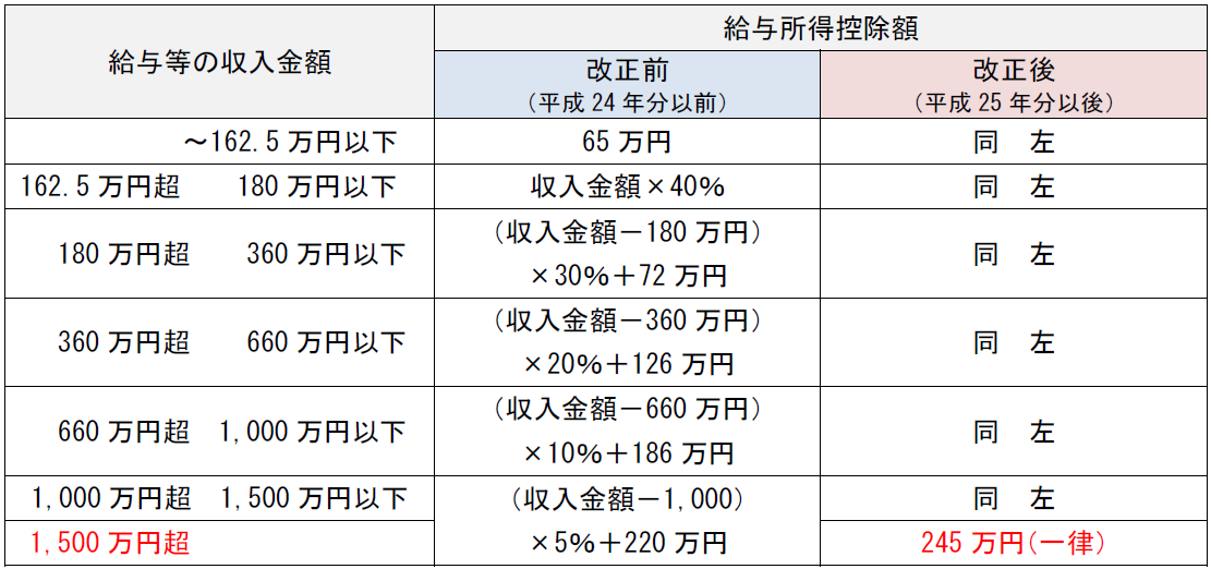 そこで、平成24年度の税制改正により、給与等の収入金額が1,500万円を超える場合には、給与所得控除額を一律245万円とすることになった(所法28③六)。