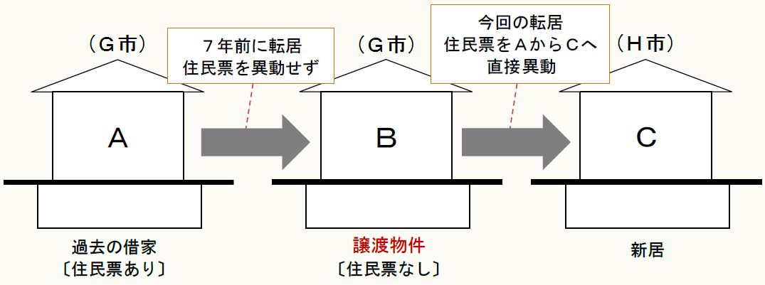 Xは、Bを購入する3年ほど前から同じG市の借家Aで生活をしており、7年前に同市内のBに転居したのですが、住民票を異動せずにそのままにしておいたので、今回のCへの転居にあたっては、従前の借家A時代の住民票上の住所から直接C(H市)への転居という形をとりました。